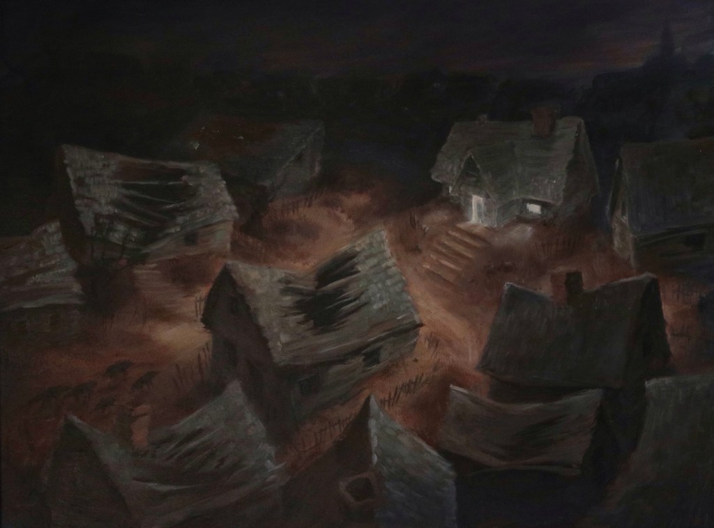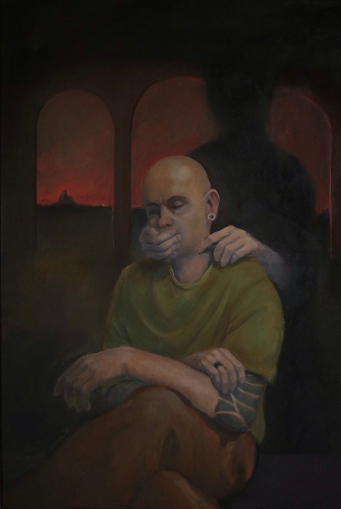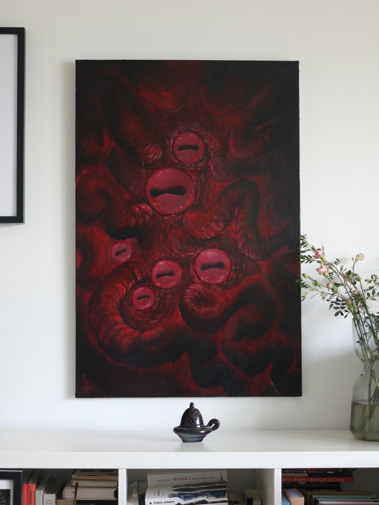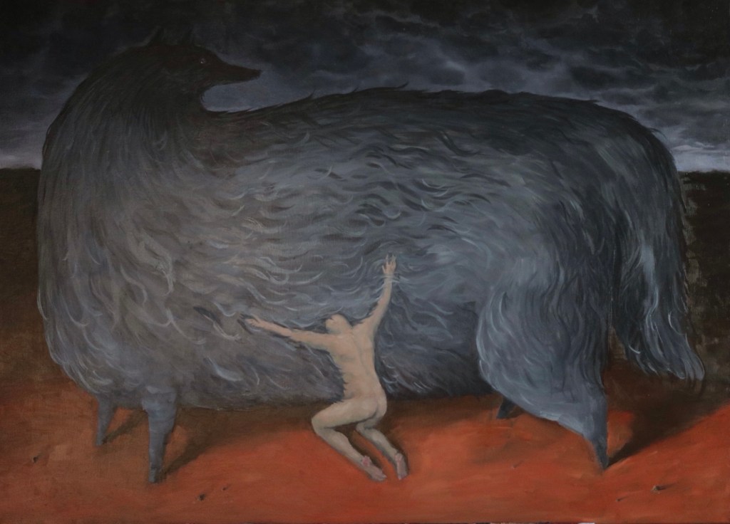 Ten obraz zaczął się od snu. Chciałem oddać ten moment i emocje, które w nim przeżyłem. Ogromny wilk, w którego się wtuliłem był bezpieczną ostoją.